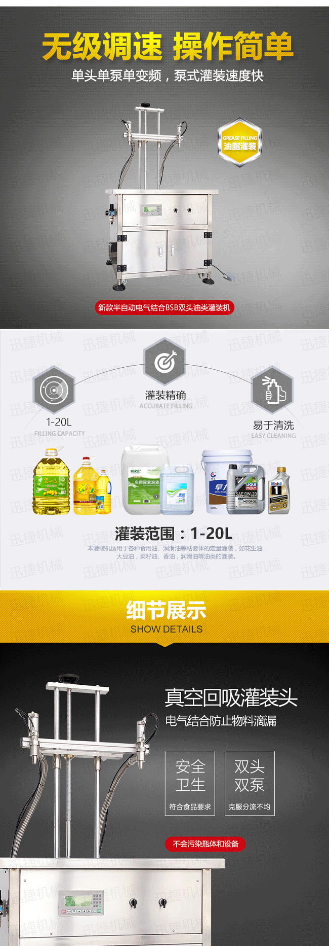 半自動食用油灌裝機適用于各種食用油、潤滑油等粘液體的定量灌裝,如花生油,大豆油,菜籽油、香油,潤滑油等油類的灌裝。采用先進的定量灌裝技術,結合微電子智能控制技術單頭單變頻控制系統(tǒng),實現高精度、無級調速,操作簡單。各個灌裝頭可在一定范圍內任意調節(jié)間距和灌裝量,可使用各種大小形狀的容器的灌裝。自動化程度高。另外,機身零件采用優(yōu)質不銹鋼制造,即耐用又衛(wèi)生,長時間工作性能可靠穩(wěn)定。達到GMP衛(wèi)生要求。本公司產品通過了IS9000質量體系認證。本設備經久耐用,性能穩(wěn)定,是食用油、潤滑油等行業(yè)理想的灌裝設備。