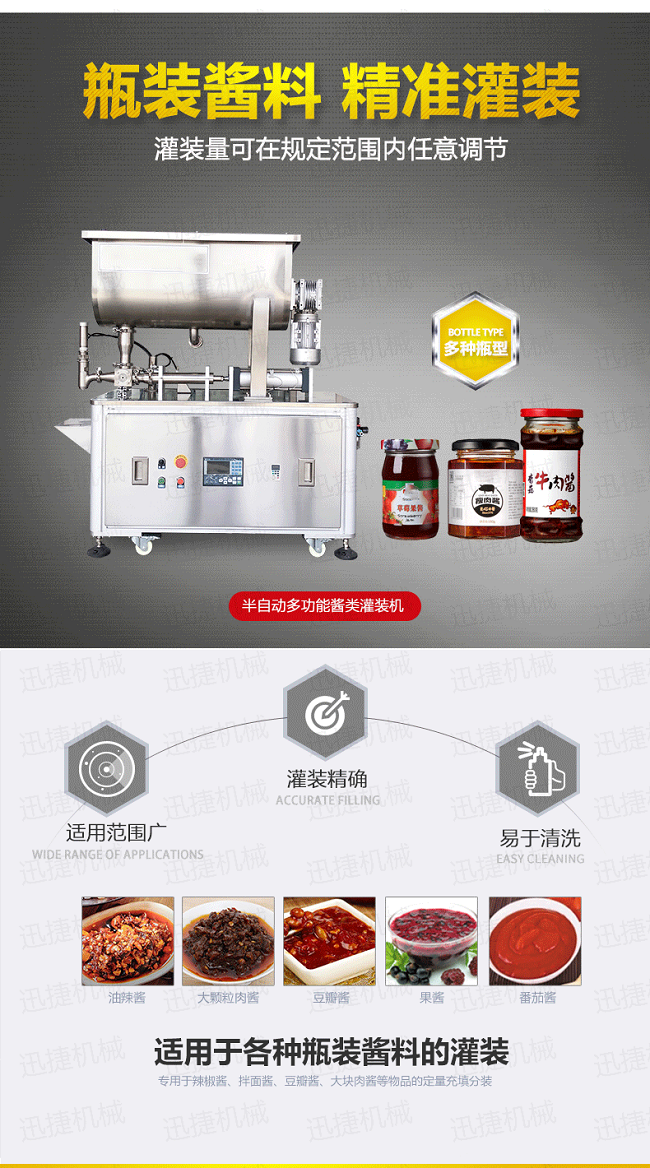 本瓶裝辣椒醬灌裝機專用于辣椒醬、拌面醬、豆瓣醬、大塊肉醬等物品的定量充填分裝,適合于將各類粘稠體及含有各種固體物質(zhì)如辣椒、花生、肉塊、佐料等物體的醬類灌裝各種容器中,適用于各種瓶裝醬料的灌裝。