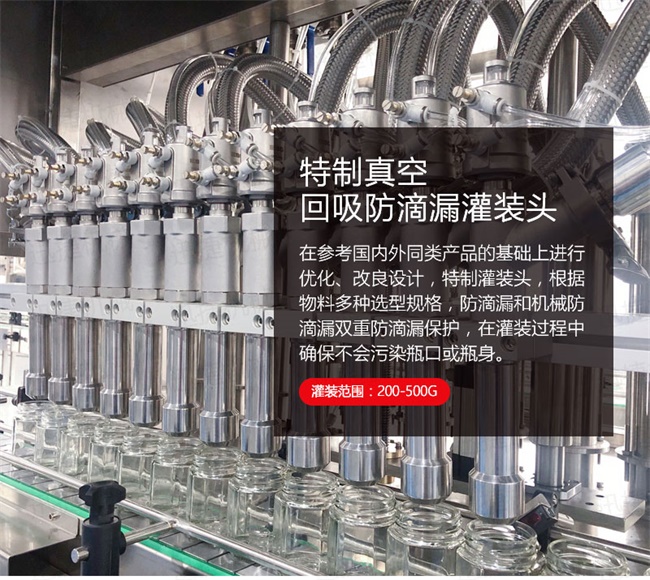 3、灌裝機采用橫推料的方式,大大縮短了下料斗到灌裝頭的距離,提高了灌裝速度,更重要的是解決了含油量大的物料在灌裝過程中出現(xiàn)的有些瓶油多,有些瓶醬多的灌裝難題,大大提高了灌裝精度。