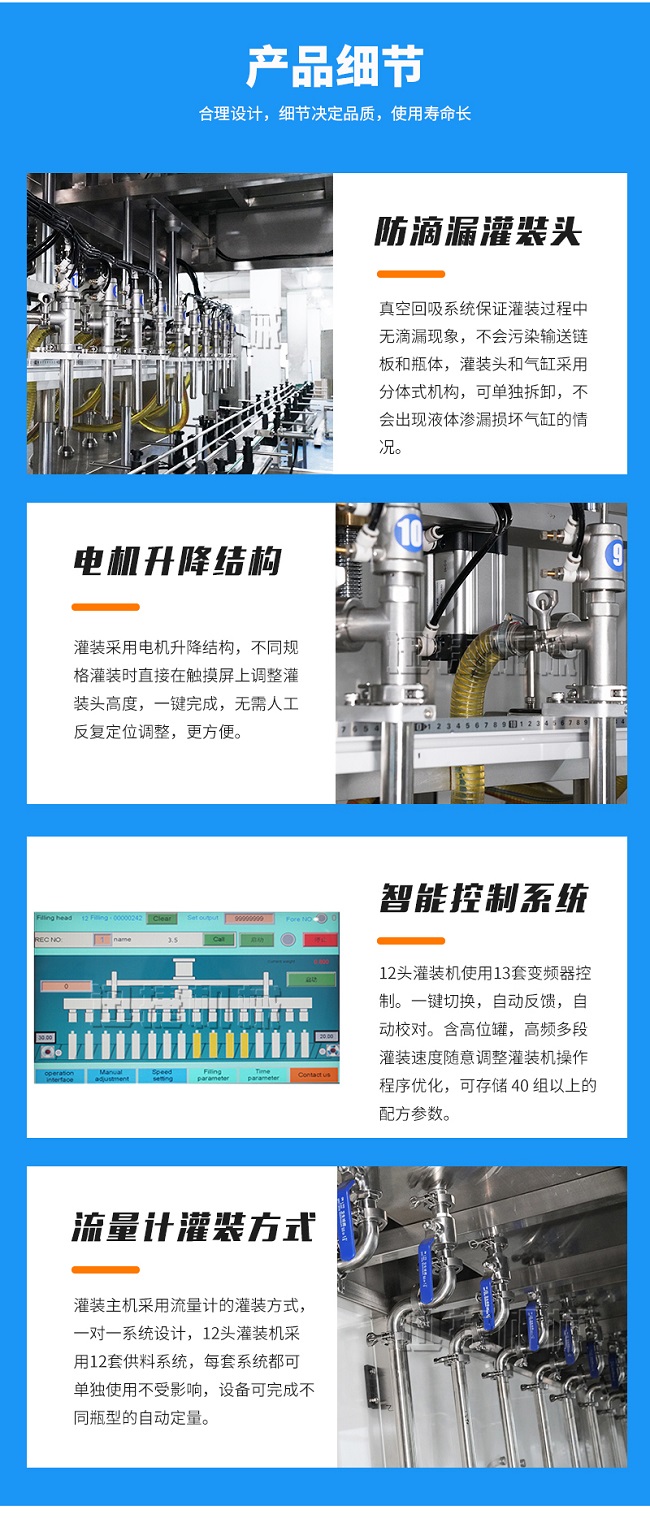 機(jī)器應(yīng)用范圍:1-10升通用型號(hào),機(jī)器采用流量計(jì)計(jì)量,觸摸屏控制,參數(shù)一鍵調(diào)整,方便快捷??梢怨嘌b各種油脂,油料。灌裝頭采用專(zhuān)用的油脂防滴漏灌裝頭,不滴漏。機(jī)器設(shè)定有快慢速技術(shù),可以先快后慢,防止物料噴濺。保持生產(chǎn)車(chē)間干凈潔凈。