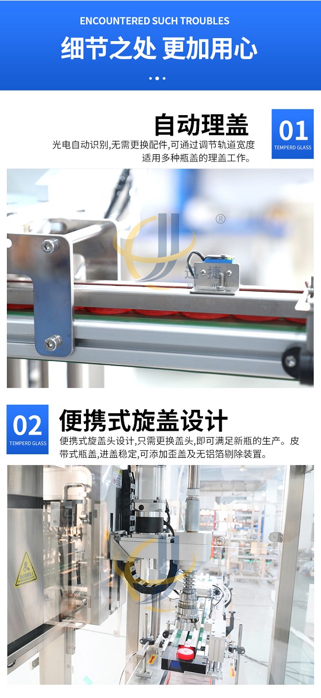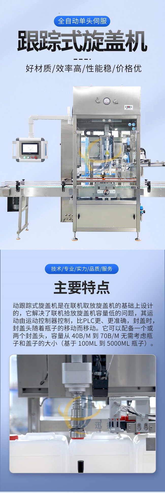 跟蹤式旋蓋機(jī)是在聯(lián)機(jī)取放旋蓋機(jī)的基礎(chǔ)上設(shè)計的,它解決了聯(lián)機(jī)拾放旋蓋機(jī)容量低的問題,其運動由運動控制器控制,比PLC更、更準(zhǔn)確,封蓋時,封蓋頭隨著瓶子的移動而移動。它可以配備一個或兩個封蓋頭,容量從 40B/M 到70B/M 無需考慮瓶子和蓋子的大小(基于 100ML到5000ML瓶子)。