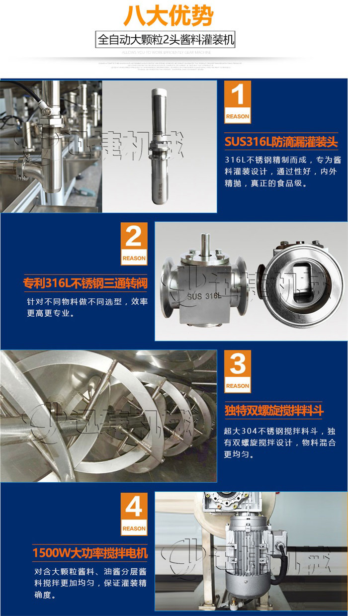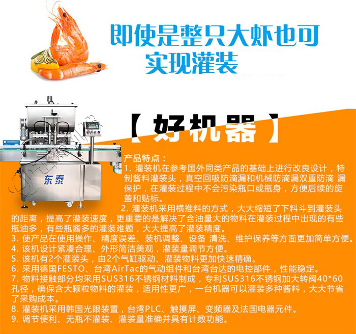該系列灌裝機(jī)采用活塞式氣缸氣動原理,適用于調(diào)味品中帶顆粒并且濃度較大的香菇醬、辣椒醬、豆瓣醬、花生醬、芝麻醬、果醬、牛油火鍋底料、紅油火鍋底料等較為粘稠醬類的灌裝。灌裝轉(zhuǎn)閥可以很具客戶物料定做加大,以適應(yīng)不同客戶物料的灌裝需求。