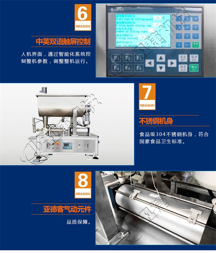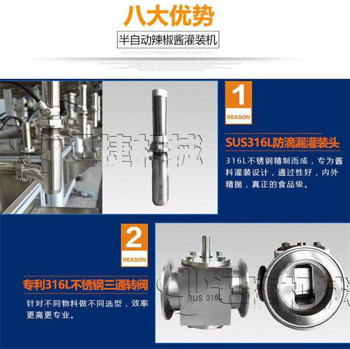 半自動辣椒醬灌裝機適合于將各類粘稠體及含有各種固體物質(zhì)如辣椒、花生、肉塊、佐料等物體的醬類和油、料分離的火鍋底料等灌裝于各種容器中,適用于辣椒醬、顆粒醬料、大塊肉醬、火鍋底料等醬體的灌裝。