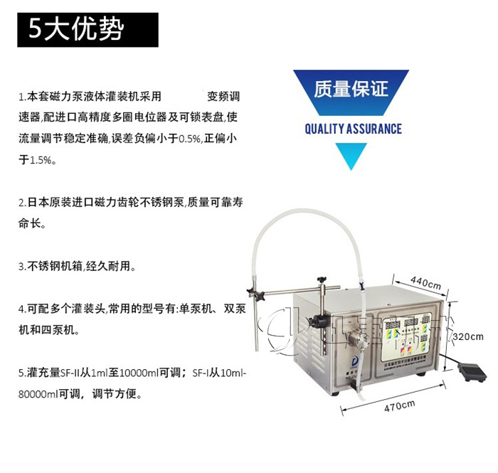 A、磁力泵液體灌裝機采用世界工廠變頻調(diào)速器,配進口高精度多圈電位器及可鎖表盤,使流量調(diào)節(jié)穩(wěn)定準確,誤差負偏小于0.5%,正偏小于1.5%;